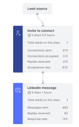 Scroll down for a detailed breakdown of each campaign step. See how many connections were sent, replies received, and emails/messages dispatched by Succeed Digital. It varies based on your campaign type and the steps included. Easily spot where your leads stand in the campaign.